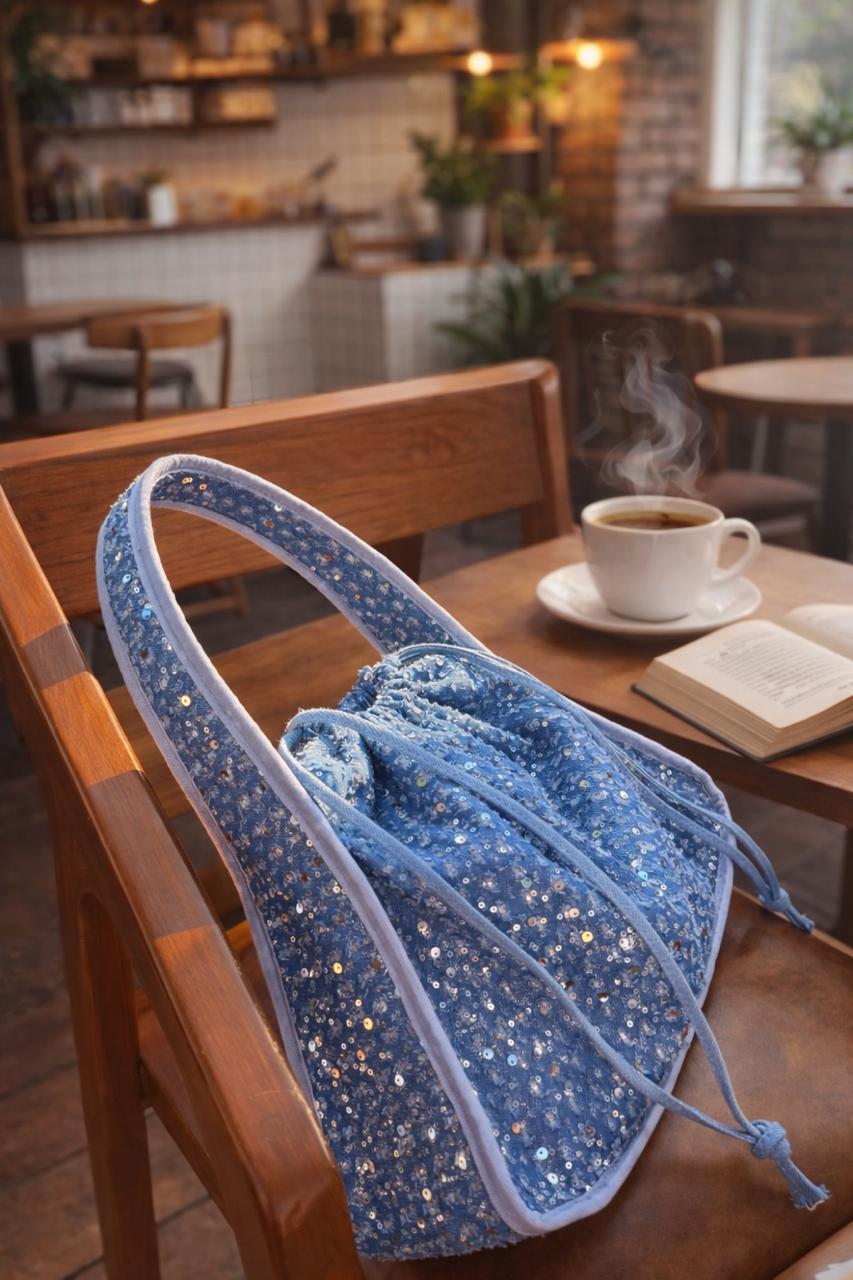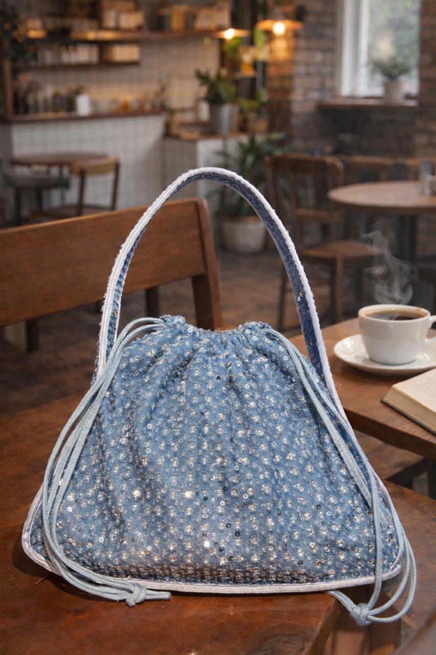 Crafted in soft, lightweight denim and delicately adorned with fine sequins, this piece catches the light beautifully without overpowering your look. The relaxed drawstring silhouette adds a touch of ease, while the structured shoulder strap ensures comfort and versatility — perfect for brunches, coffee dates, casual evenings, or travel days.