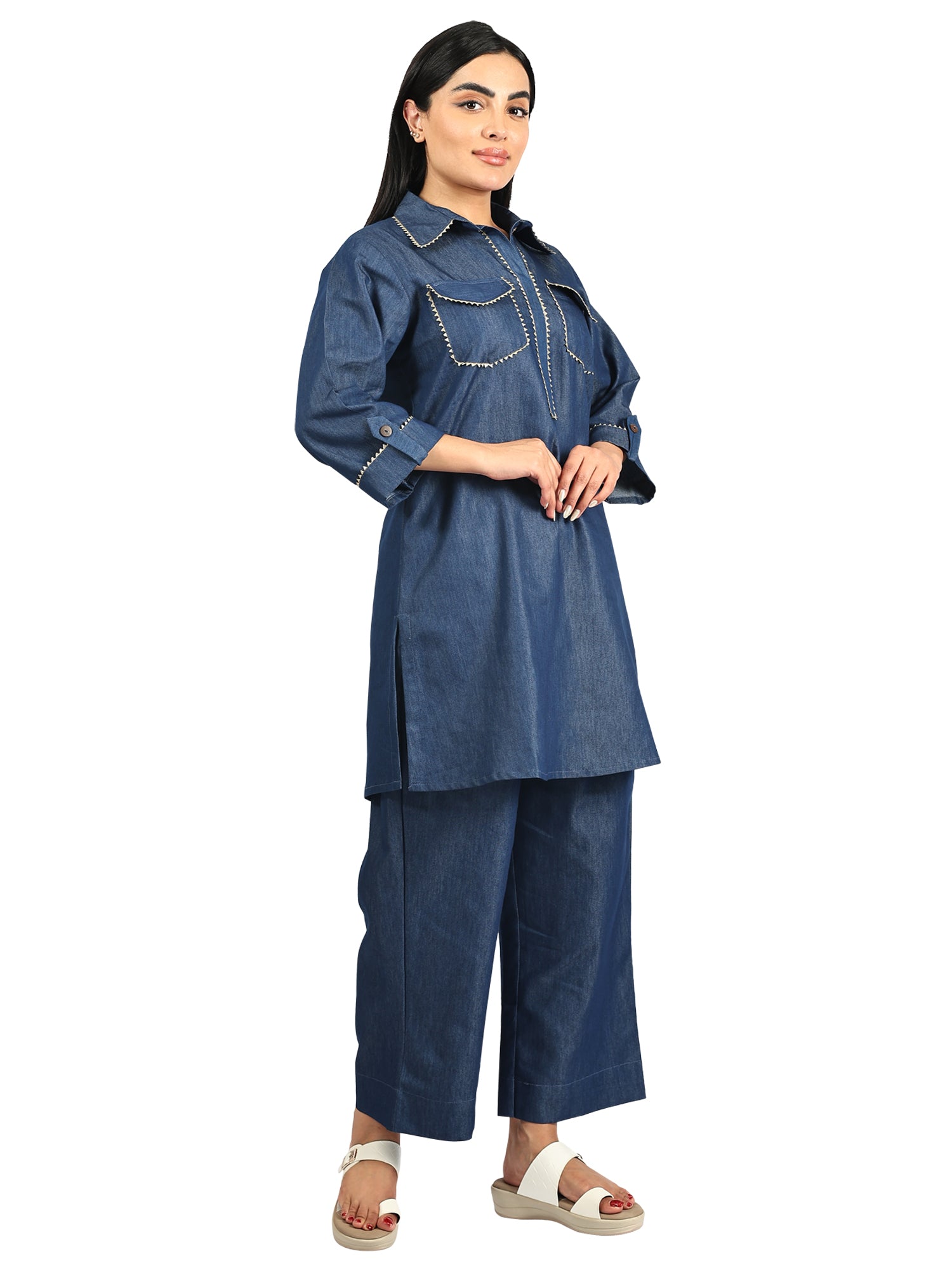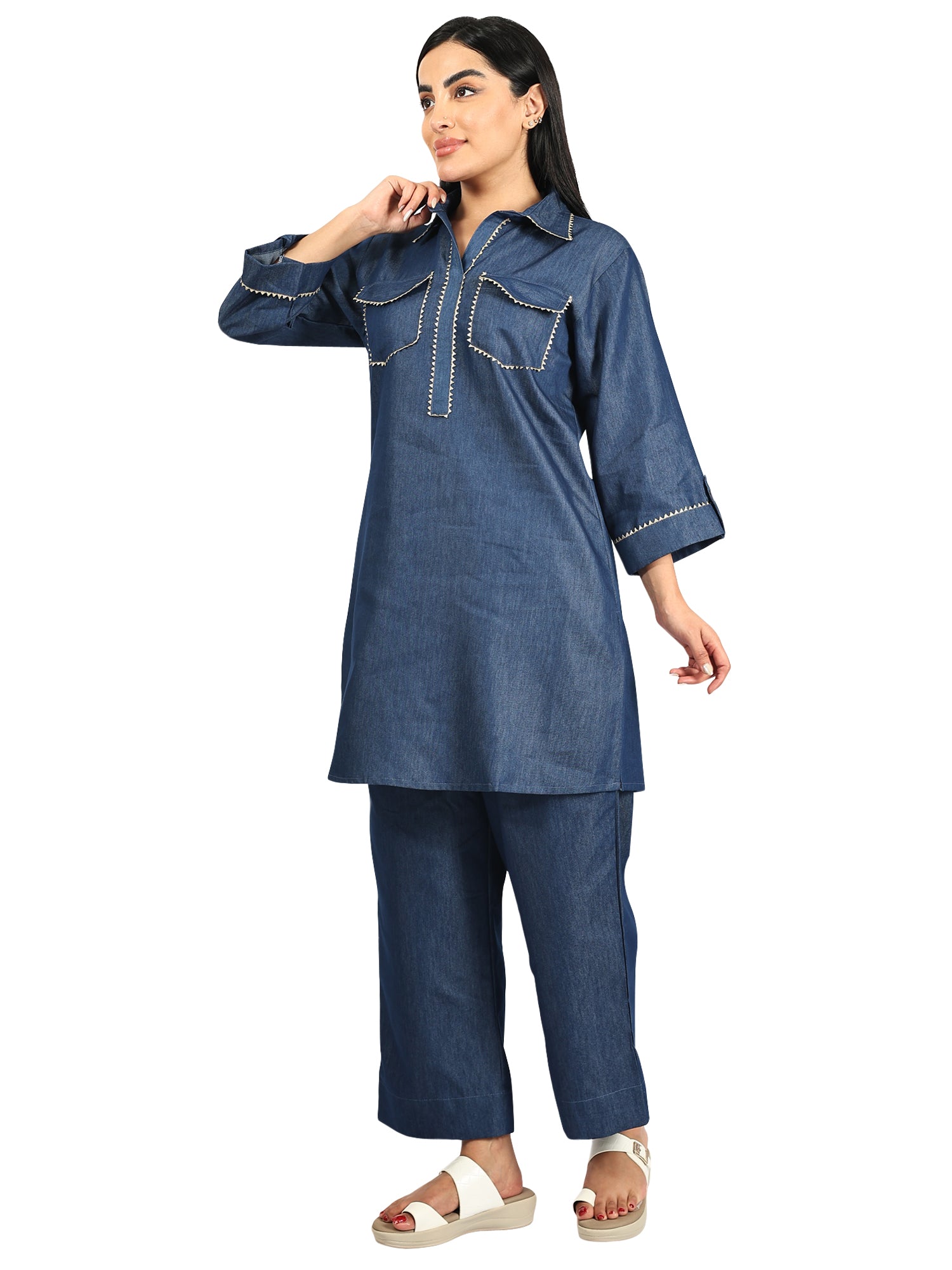 A modern interpretation of a classic silhouette, the custom made Pathani Denim Co-ord Set is crafted for effortless style and everyday comfort. Made from soft, breathable denim, this two-piece set features a structured Pathani-style kurta paired with relaxed straight-fit pants.